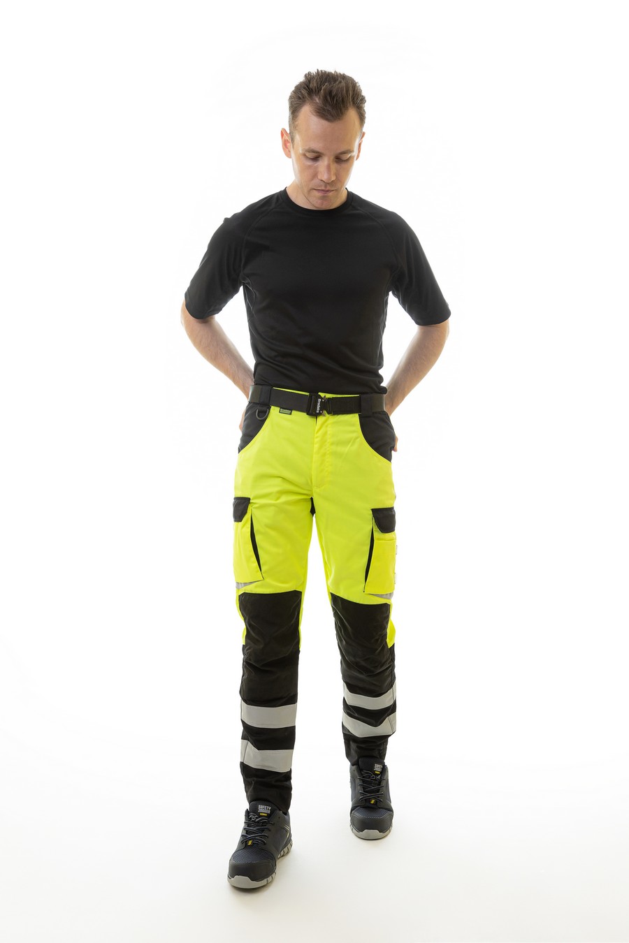 Сигнальные брюки BRODEKS KS309, желтый/черный - практичные рабочие брюки 2 класса видимости. За счёт флуоресцентного жёлтого цвета и широких светоотражающих лент отлично подходят для работы в тёмных помещениях и на объектах, где важна заметность.