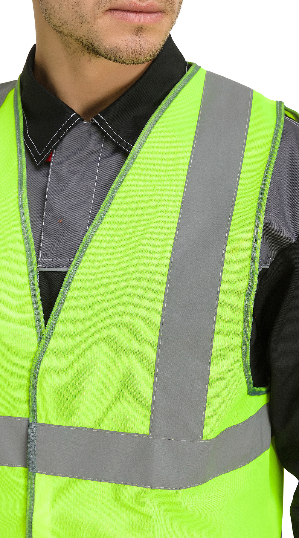 Жилет выполнен с застежкой налипучку. Нанесены световозвращающие материалы Скотчлайт