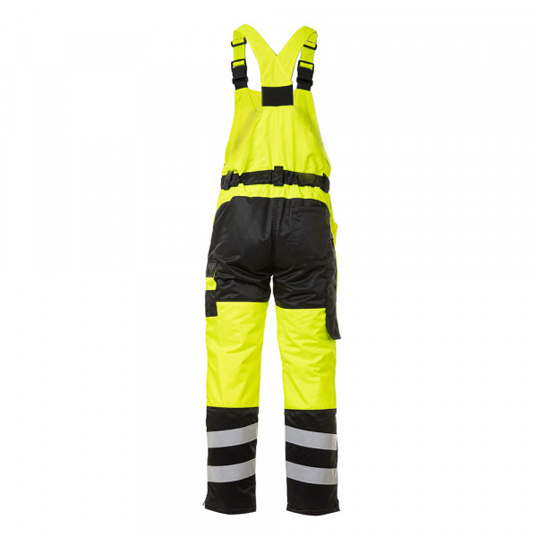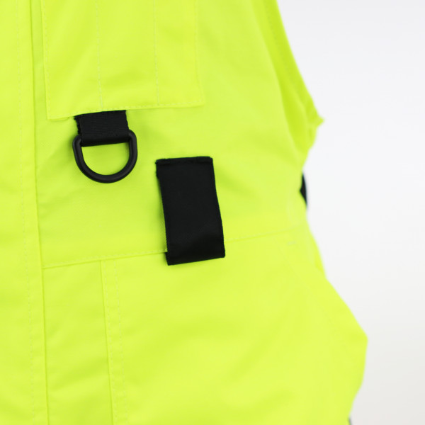 Полукомбинезон сшит из жёлтой флуоресцентной ткани, места, склонные к быстрому загрязнению выполнены из ткани чёрного цвета. По низу штанин пущены широкие светоотражающие полосы.